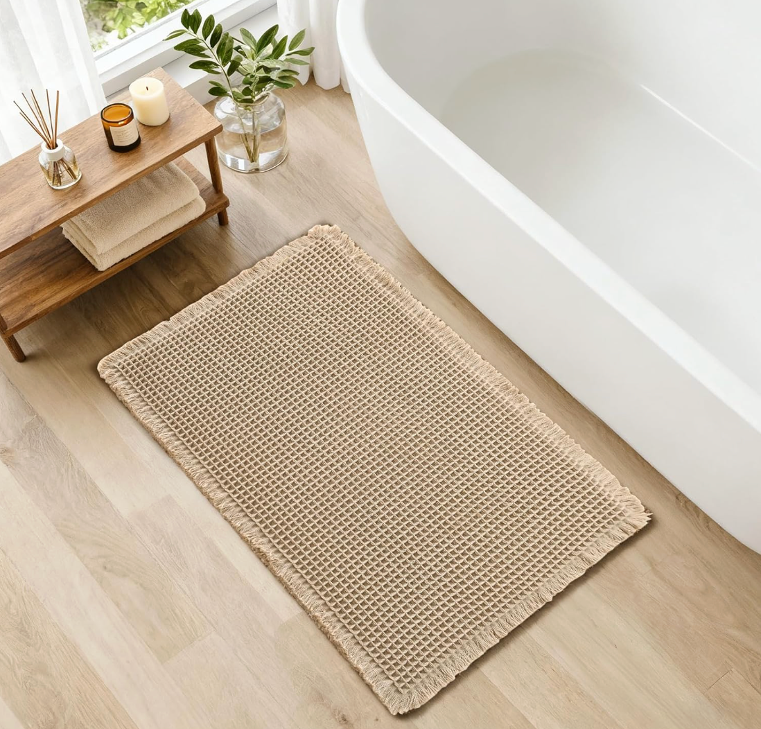 Dale un toque elegante y cálido a tu baño con nuestra alfombra tipo waffle. Fabricada con fibras reforzadas y diseño antideslizante, combina estilo, comodidad y funcionalidad para mantener tus pies secos y tu baño seguro.