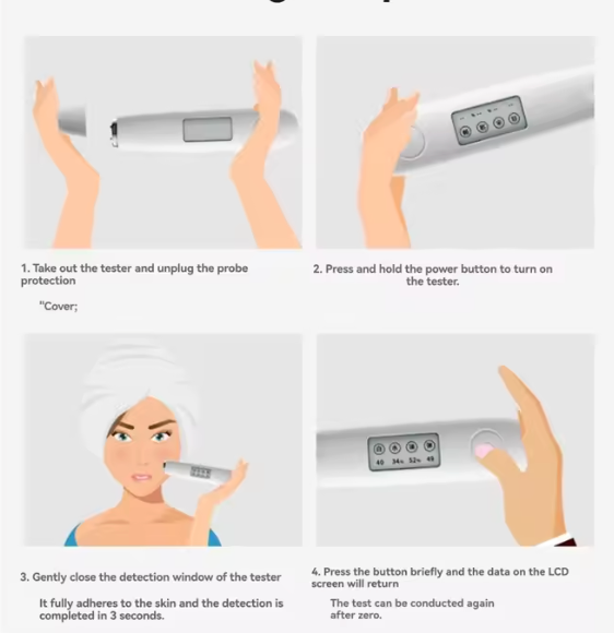 - Medición precisa de los niveles de agua y aceite en la piel, también mide el biotipo cútaneo y la elasticidad de la piel.