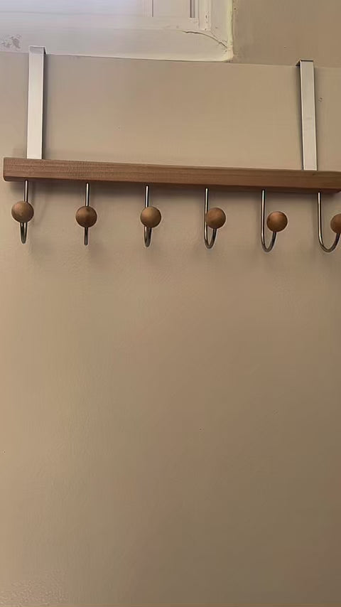 Añadí practicidad y orden a tu hogar con este perchero colgante para puerta, ideal para aprovechar al máximo el espacio sin necesidad de taladrar paredes. Su diseño moderno con estructura de hierro y madera y ganchos esféricos aporta un toque decorativo y funcional al mismo tiempo.